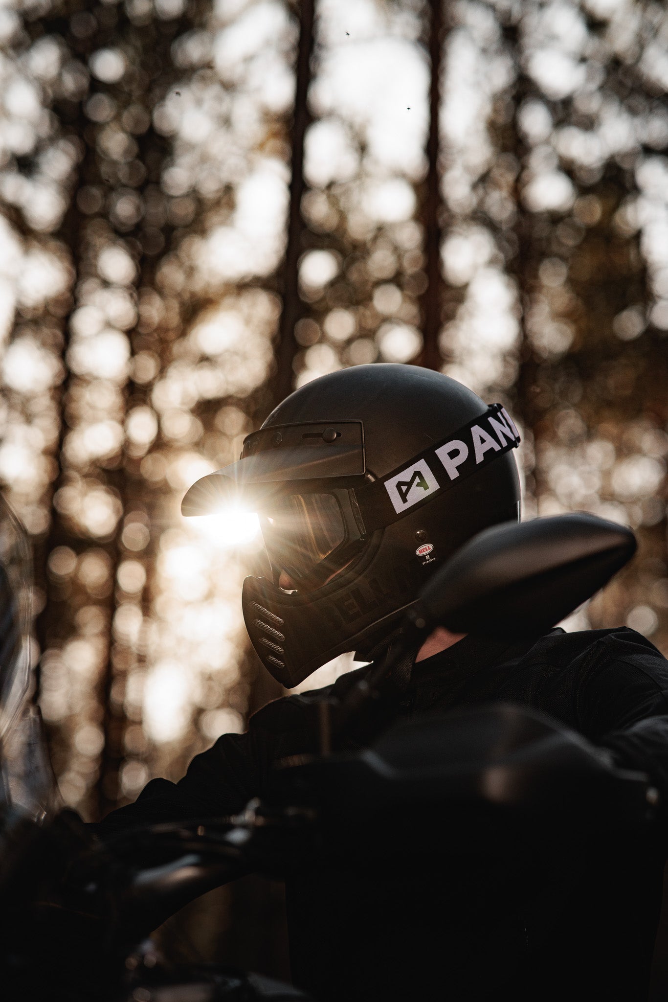 Featuring a minimalist matte black frame, these lightweight motorcycle goggles pair seamlessly with any helmet. They come with an adjustable woven strap showcasing the Pando Moto logo, with anti-slip silicone on the back for a secure fit.